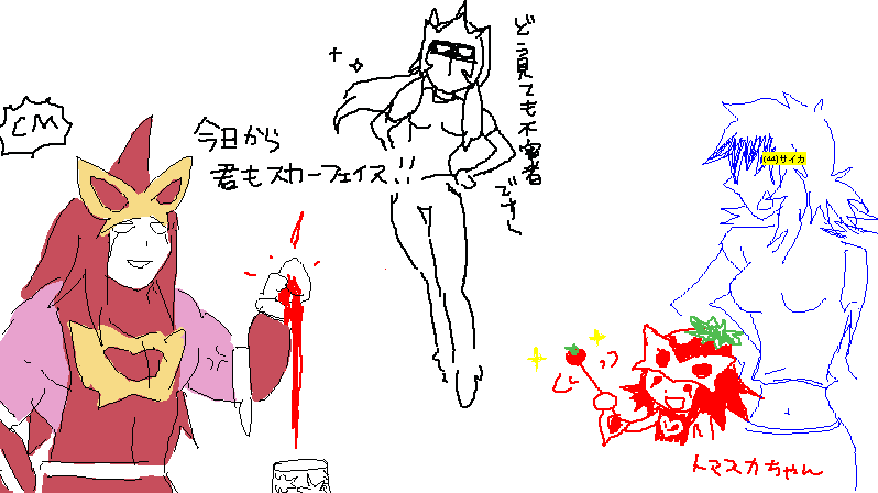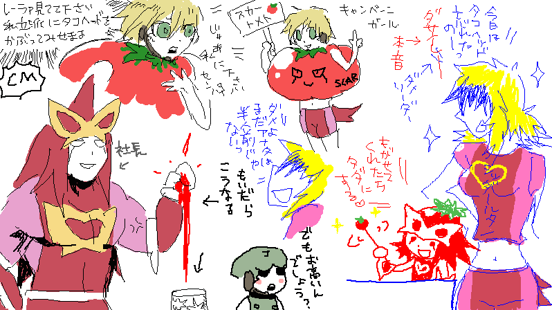 最初各々のトリニを描いていたのですがムルキさんのトマトが両隣に感染して画面が真っ赤であります。
